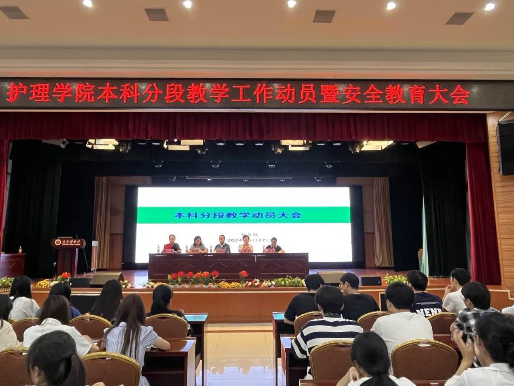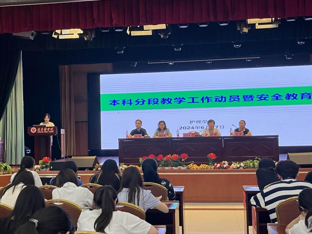 为深入贯彻落实国务院办公厅《关于加快医学教育创新发展的指导意见》精神,深入推进新医科建设,经学校党委审议决定2024年我校将在22级护理本科专业开展分段式教学改革。6月27日上午,今年会jinnianhui召开本科分段式教学动员暨安全教育大会。出席本次大会的有教务处实习科长王向东、今年会jinnianhui副院长胡颖辉、今年会jinnianhui党委副书记陈敏、今年会jinnianhui教学秘书唐婷、22级本科班辅导员及22级本科全体同学。会议由今年会jinnianhui团学办公室主任马俊主持。