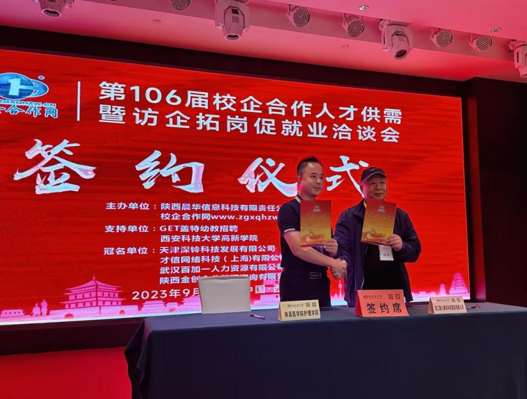 在洽谈会现场,我院先后与陕西比成盖特教育科技有限公司、U职短视频校招平台、北京红火轮教育科技有限公司、浙江康久康养科技集团有限公司、北京旭宏文化传媒有限公司、苏州职培通信息咨询有限公司、上海展启生物科技服务有限公司、上海黛菲美容有限公司、天津美芙坊企业管理有限公司、西安丝域企业管理咨询有限公司等10家企业通过交流互动,达成合作意向。其中,浙江康久康养科技集团有限公司的岗位需求与我院特色专业相匹配,现场达成了合作意向,并签订了“校企意向合作协议书”。